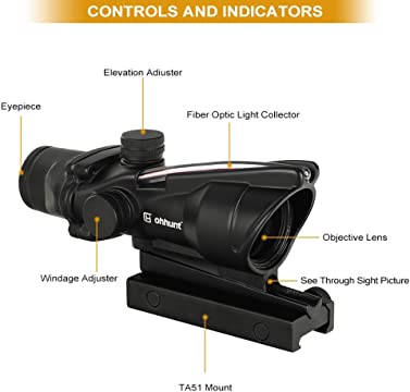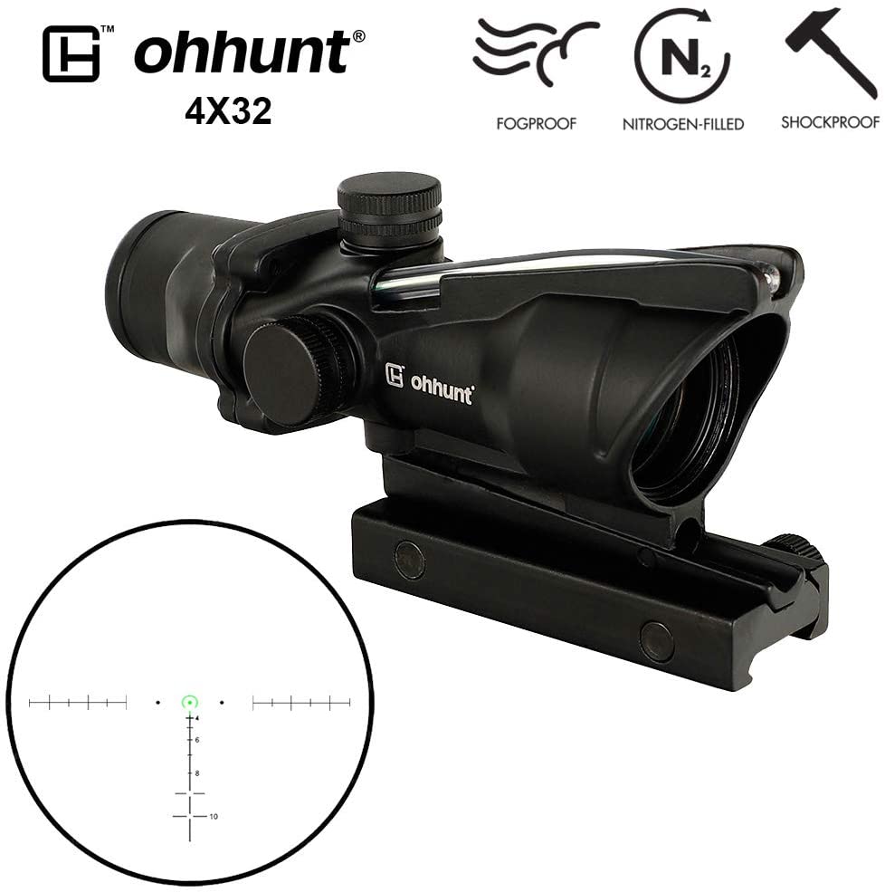 Our best ACOG clone under $100 is ohhunt 4×32 Hunting RifleScopes Red or Green Illuminated Horseshore Glass Etched Reticle Real Fiber Optics Tactical Optical Sights Scope. Wow, that is a mouthful. Let’s refer to our best ACOG clone under $100 as simply the ohhunt 4×32 ACOG clone.