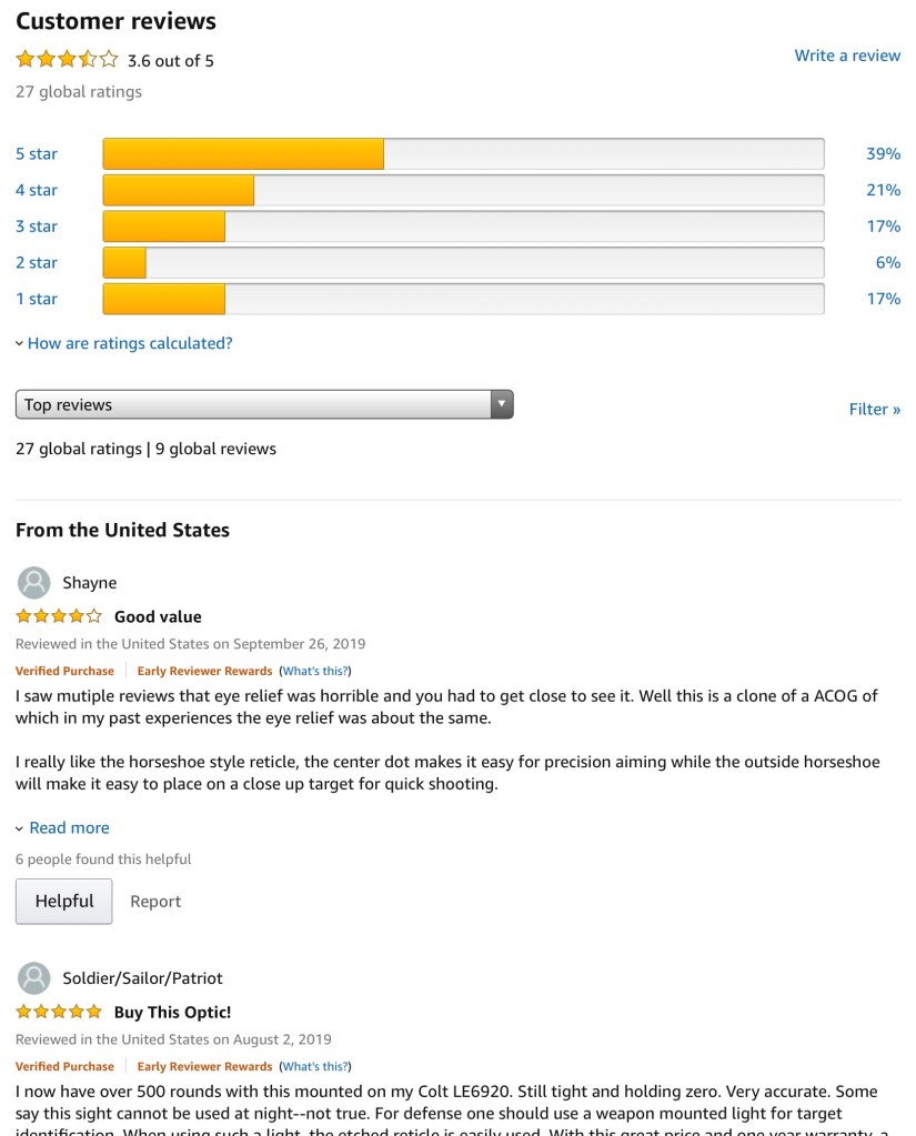 “Nice clear optic , and honestly nicer than I expected. Had no issues zeroing or holding zero on my M&P 15-22 (22lr). Sure snobs will say it’s fake and turn their nose up but I’m not putting a $1500 optic on a $300 rifle and I could care less what others think. It is well worth the money.“